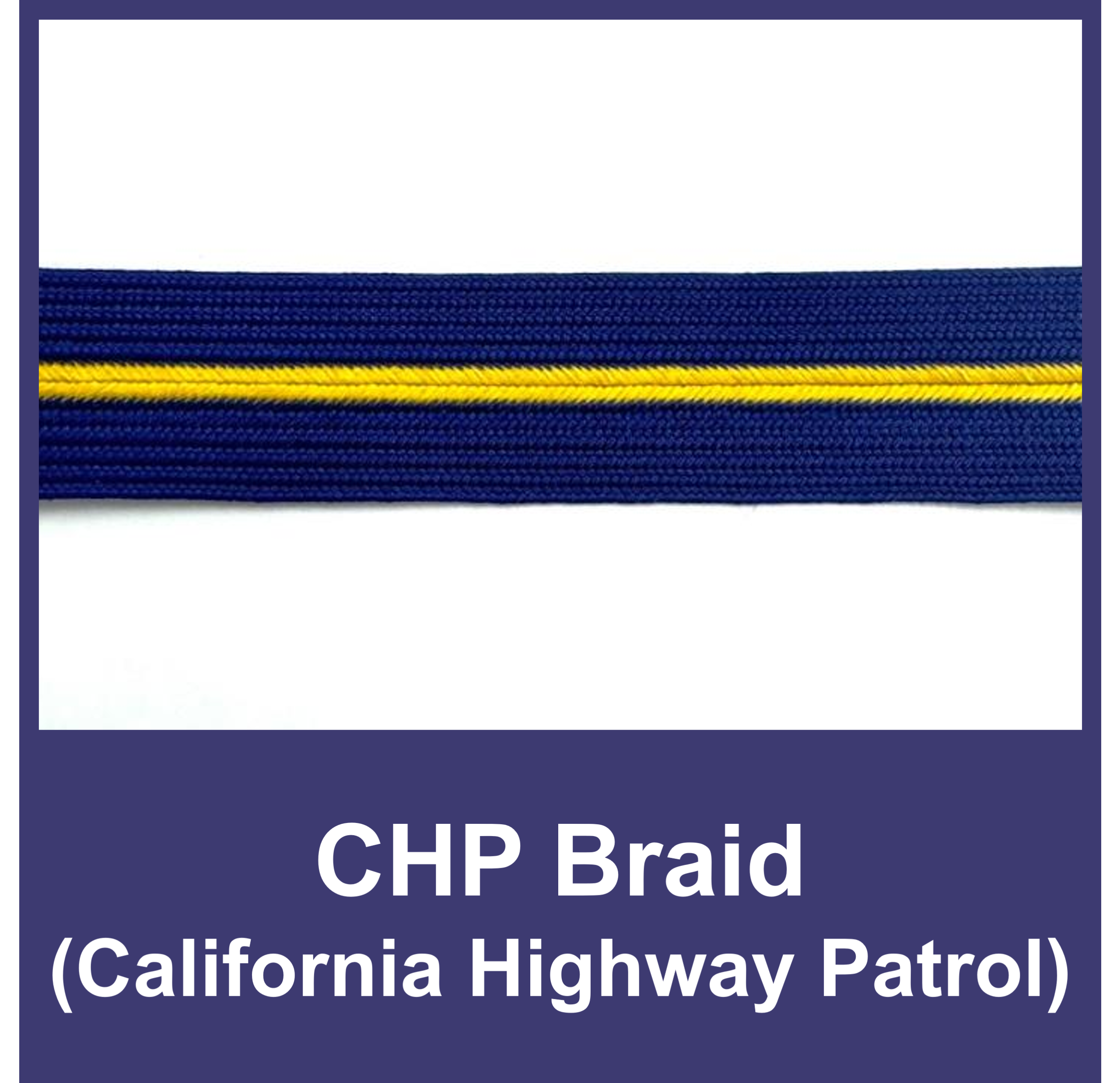 CHPs Braid is worn by the California Highway Patrol and other organizations in 1″ on their pants and 3/4″ on their sleeves. Made by ELC Industries, “Makers of Rice Braid,” in our factory in Rock Hill, South Carolina. Our braid is made to the highest quality and Made in the USA.